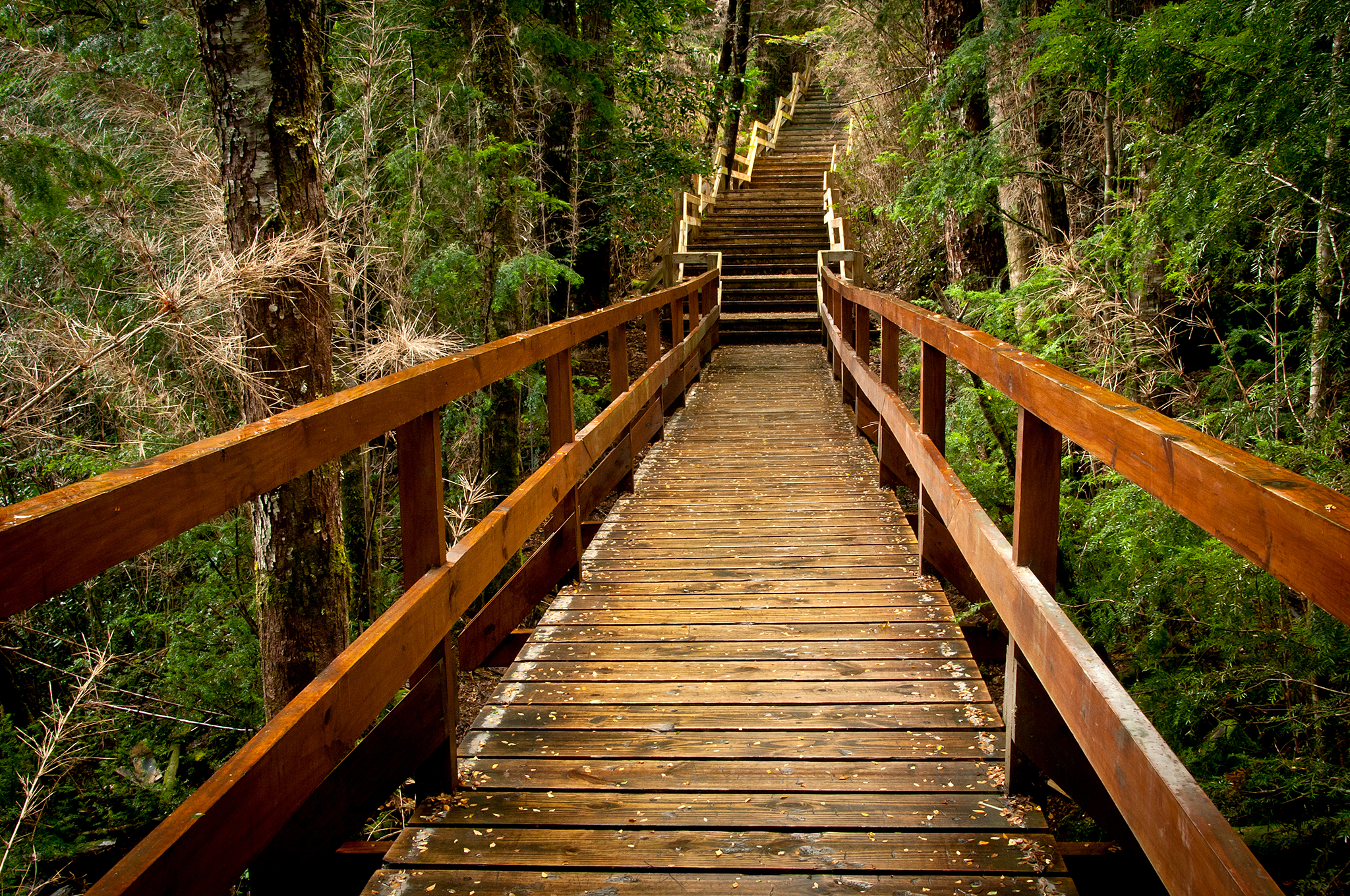 Al llegar a la cascada, subirás por un sendero de aproximadamente 700 escalones de madera que bordean el río. Durante el ascenso podrás admirar varios saltos de agua y observar un imponente Alerce milenario de más de 1.500 años.